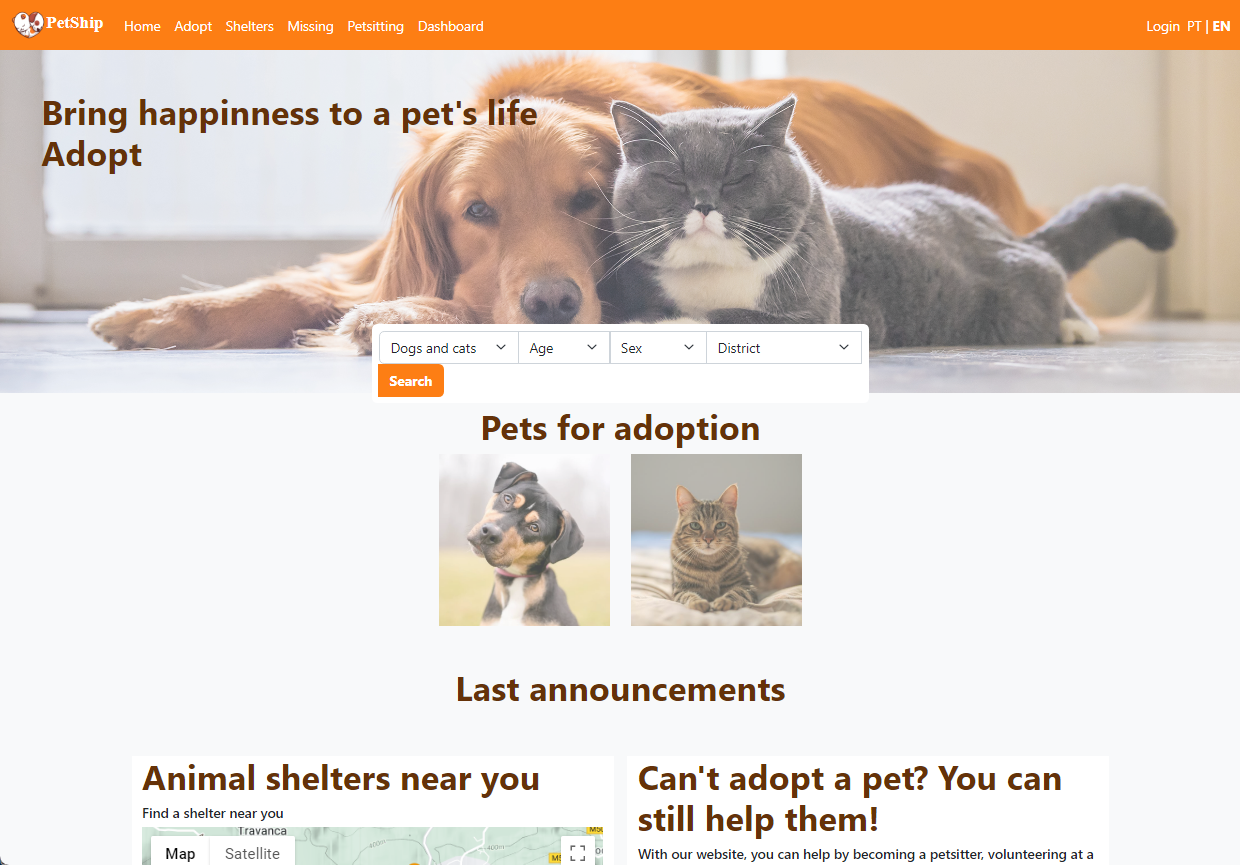 Petship is an adoption website that serves both shelters and individuals. Shelters can manage pets, food, and announcements with ease. Individuals can adopt pets and list them for adoption. This website has a custom API and is available in two languages.